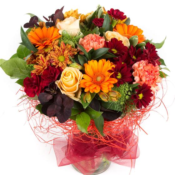 A delightful, compact bouquet of autumnal orange, red, and rust flowers in a sisal wrap presented in a glass vase.